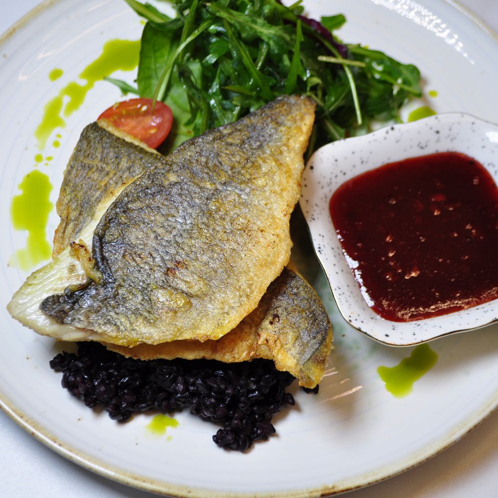 микс салата, дикий рис, рыба дорадо, соус гурман
