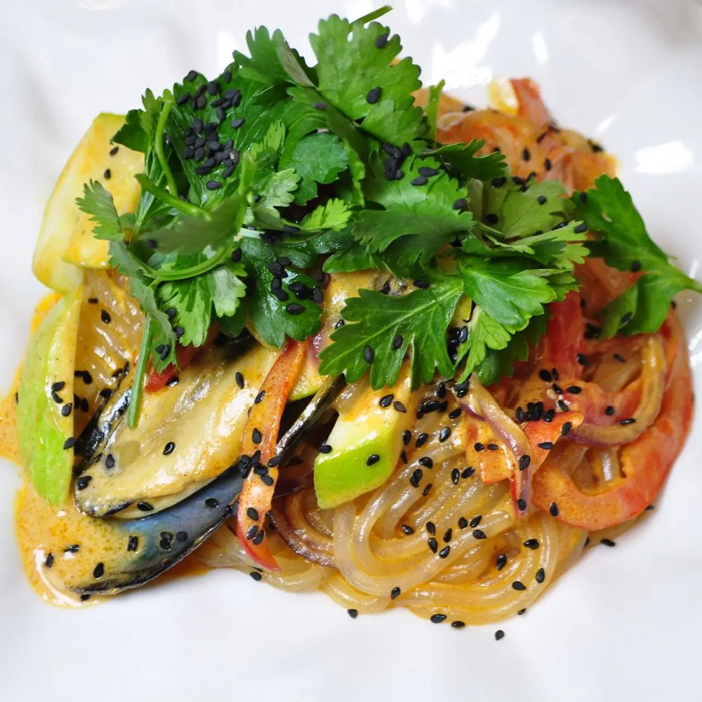 Лапша стеклянная, мидии, креветки, кабачки, цветной перец, микс зелени соус том ян, кунжут черный