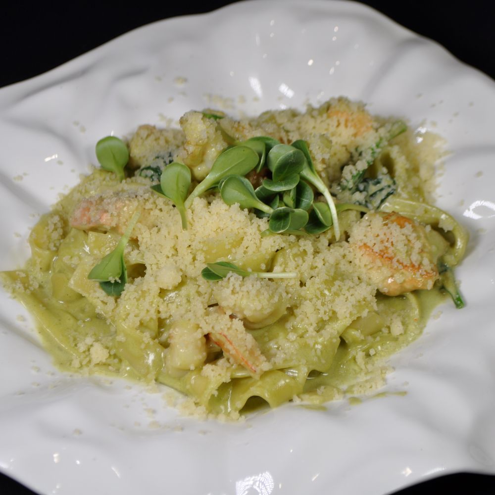 Фетучини, шпинат, креветки, семга сливки, соус терияки.