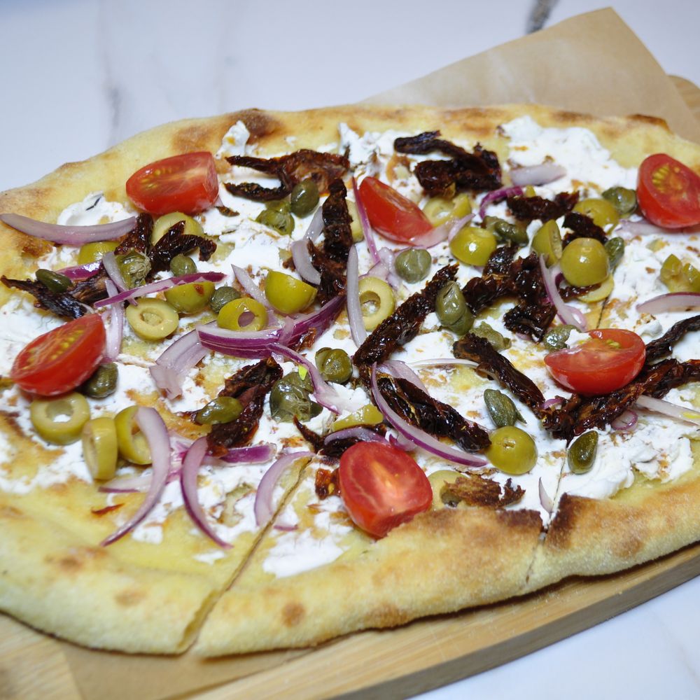 вяленный томат, маслины, красный лук, творожный сыр