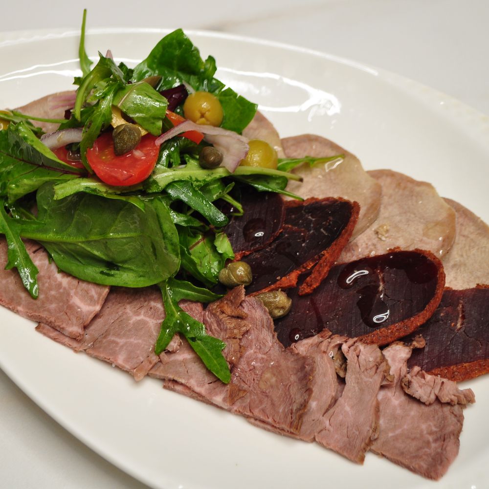 Язык говяжий, бастурма, карпаччо из говядины, микс салата