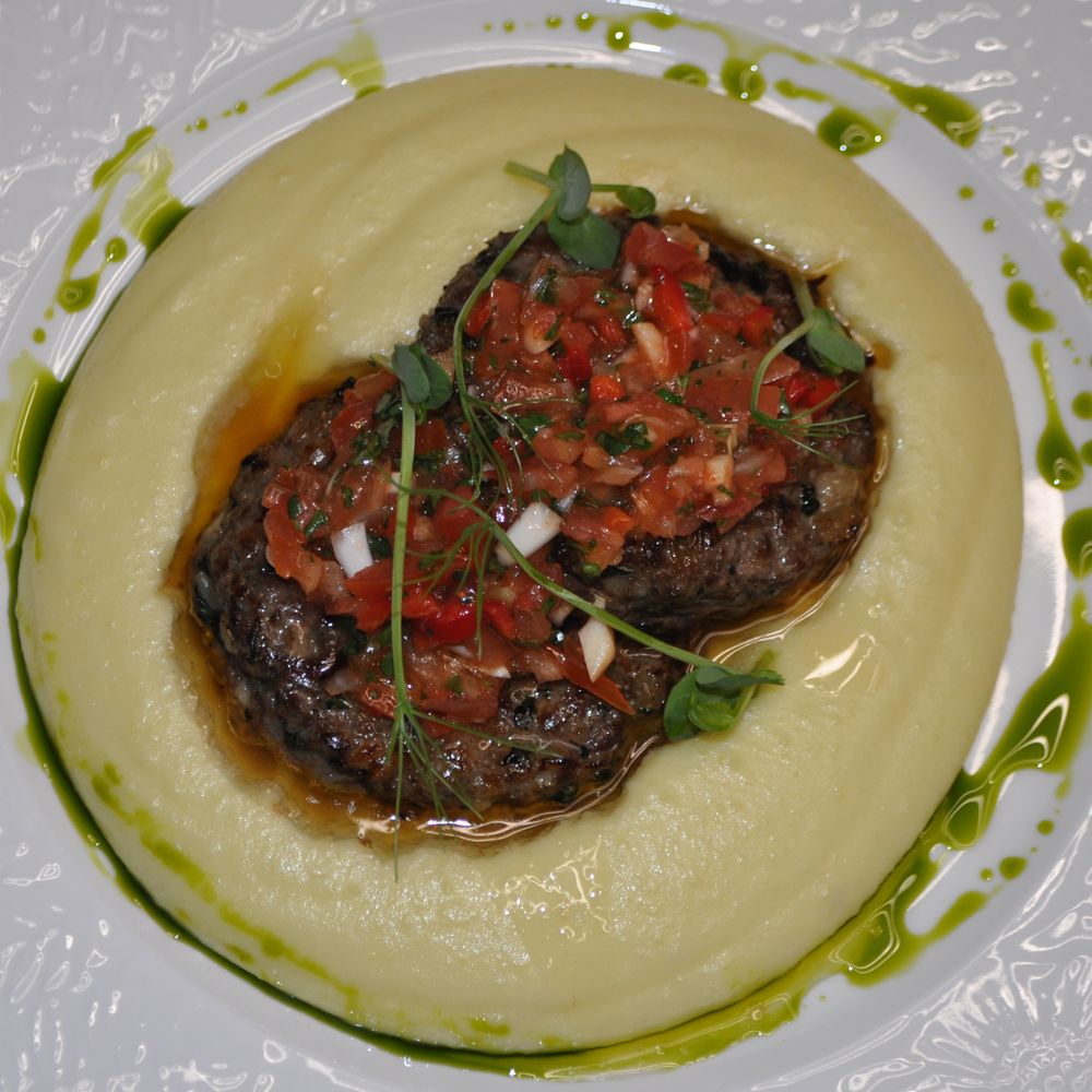 Картофельное пюре, телятина, репчатый лук, кинза, соус сальса