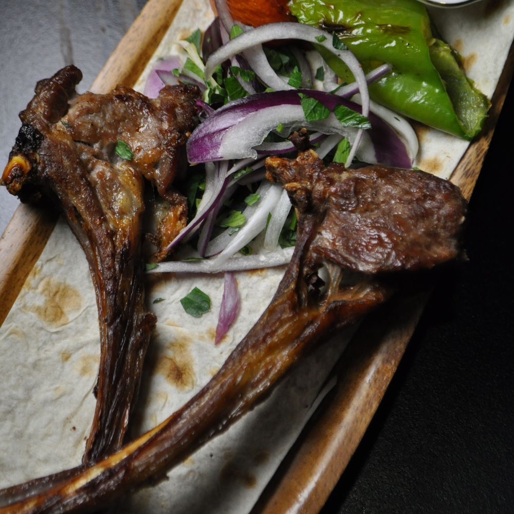 Антрекот - 2 штуки, помидор, стручковый перец, лаваш, лук, соус